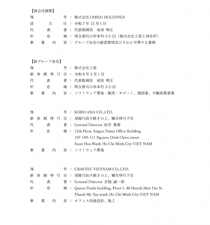 このたび、株式会社工房はさらなる事業発展を目的とし、令和8年3月1日をもちまして「株式会社OHRAI HOLDINGS」を親会社とするホールディングス体制へ移行することとなりました。