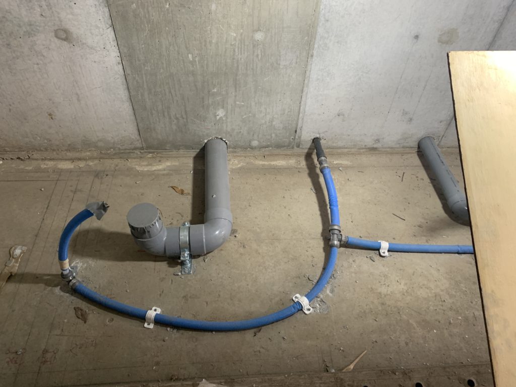 他のフロアでは水回りの配管が進んでいます。地面の墨出しから見ると狭い空間ですので、この場所はお手洗いで右向きに便器を配置するのでしょう。グレイの管は排水、ブルーの配管は給水管です。