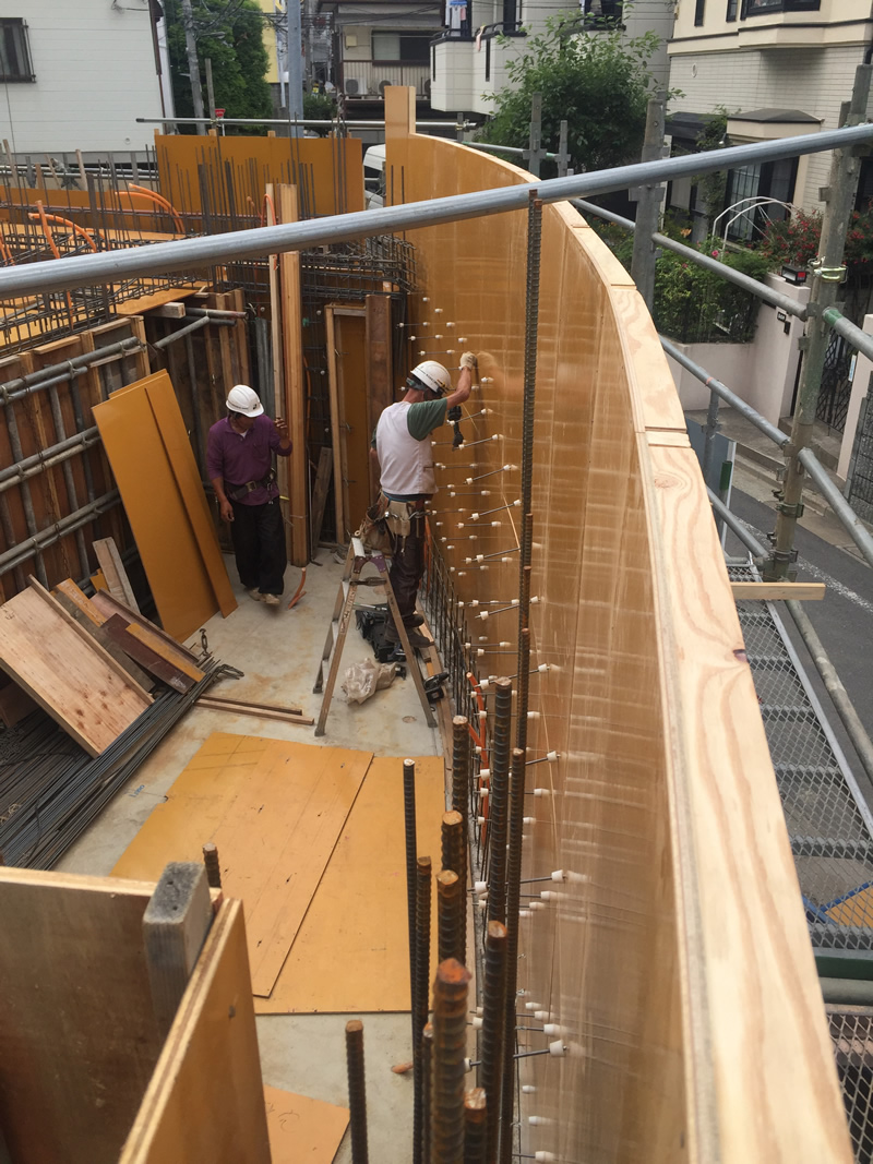 外観上のキーになる湾曲した壁面にするため湾曲が可能なコンクリート型枠用合板(コンパネ)を張っています。