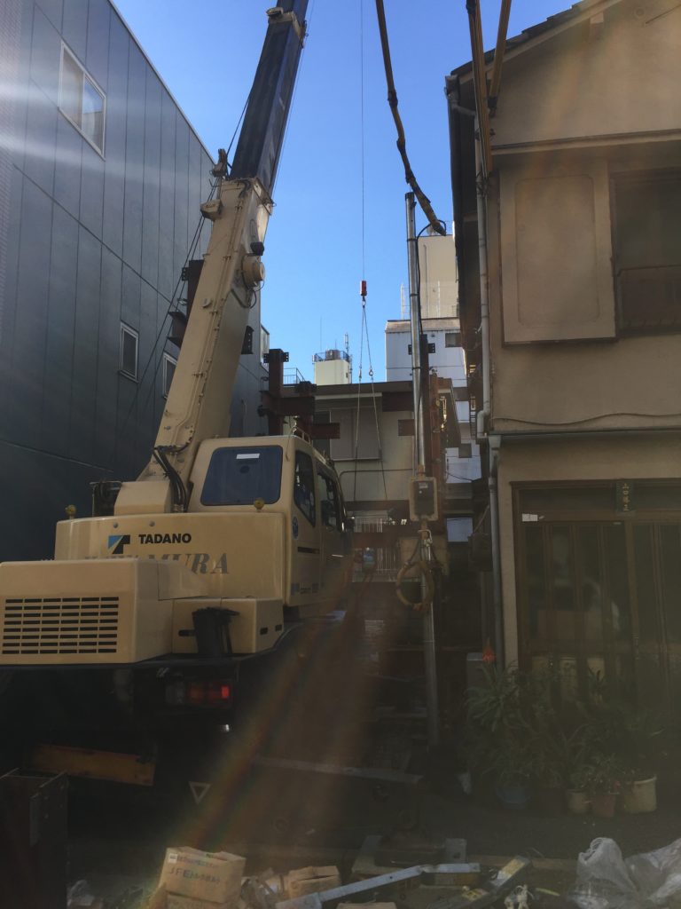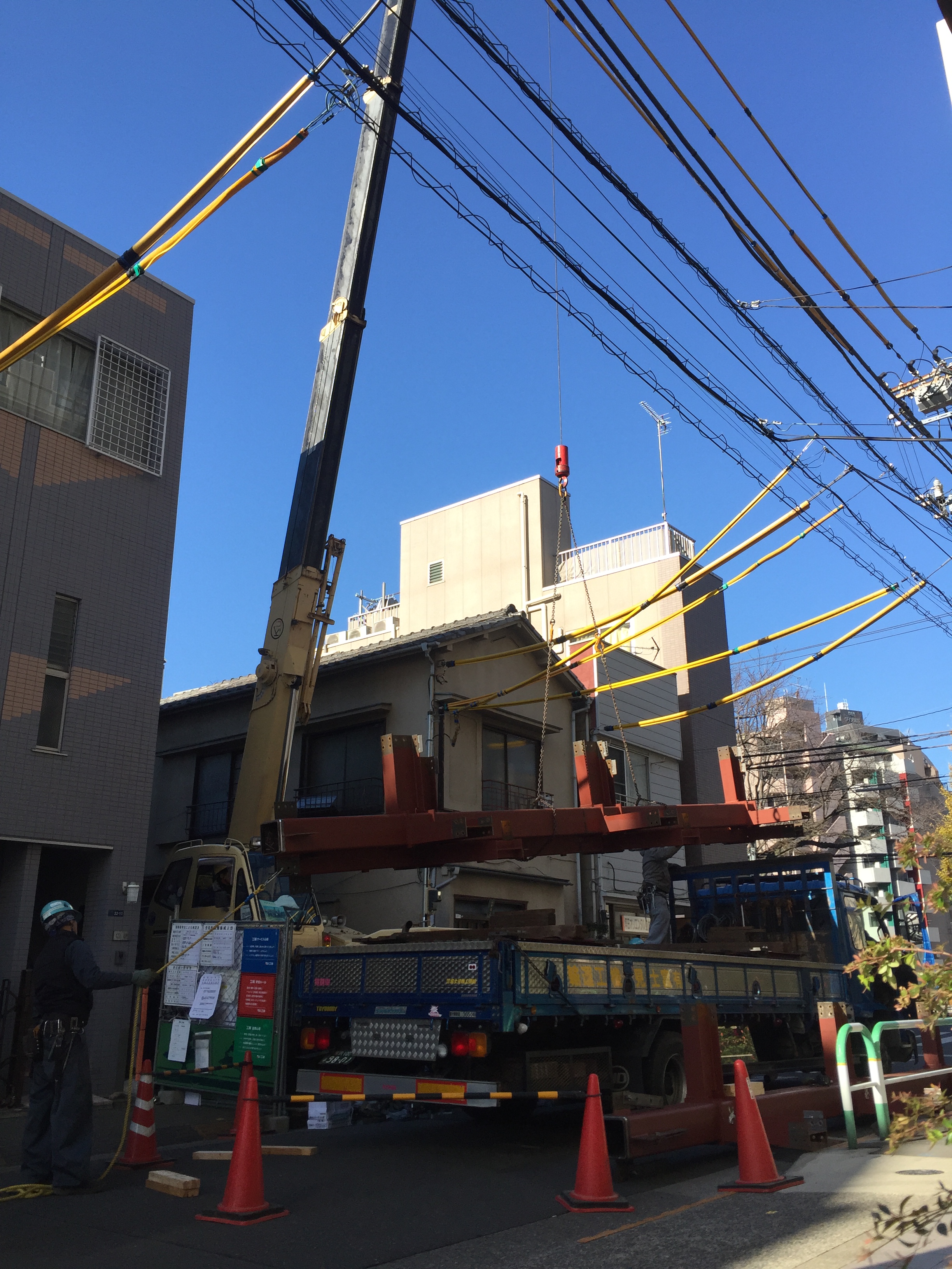 この縦柱は、一旦地面に下し、吊り下げ位置を端に変更し鉄骨を再び釣り上げ、指定位置に正確に設置していました。