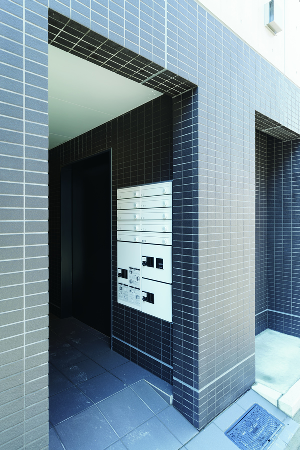 コンクリート打ちっぱなしの壁面、居室玄関ドアは黒色、電気メーターのカバー類も黒で統一しています。