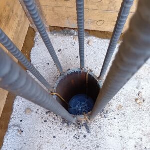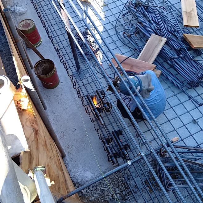 耐圧盤と基礎配筋を行っていきます。作業は基礎梁の主筋をガス圧接継手にて接合し強度の確保をします。